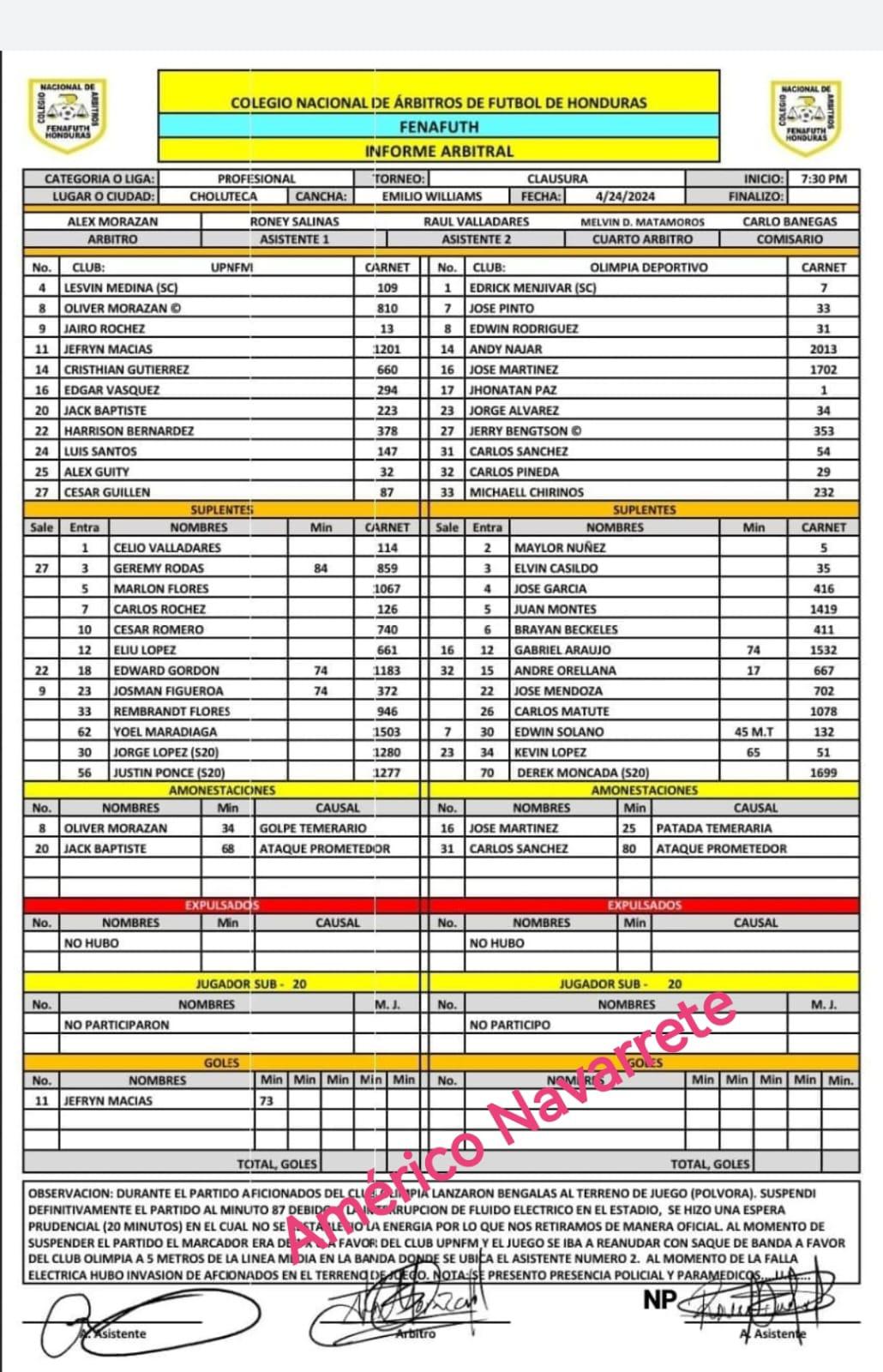 Tras todo lo sucedido, se ha revelado lo que el árbitro Alex Morazán insertó en la acta arbitral correspondiente al partido entre Lobos UPN y Olimpia disputado en la Sultana del Sur.