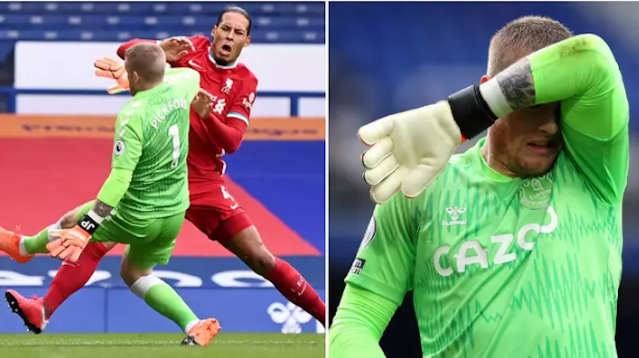 El defensa Virgil van Dijk se retiró lesionado a los 11 minutos tras una fea entrada del arquero Jordan Pickford